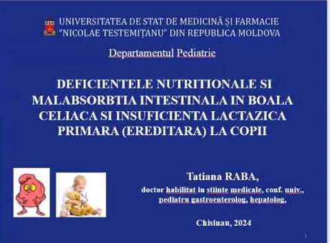 - Deficiențele nutriționale și malabsorbția intestinală în boala celiacă și insuficiența lactazică primară (ereditară) la copii (Tatiana RABA, dr. hab. șt. med., conferențiar universitar);