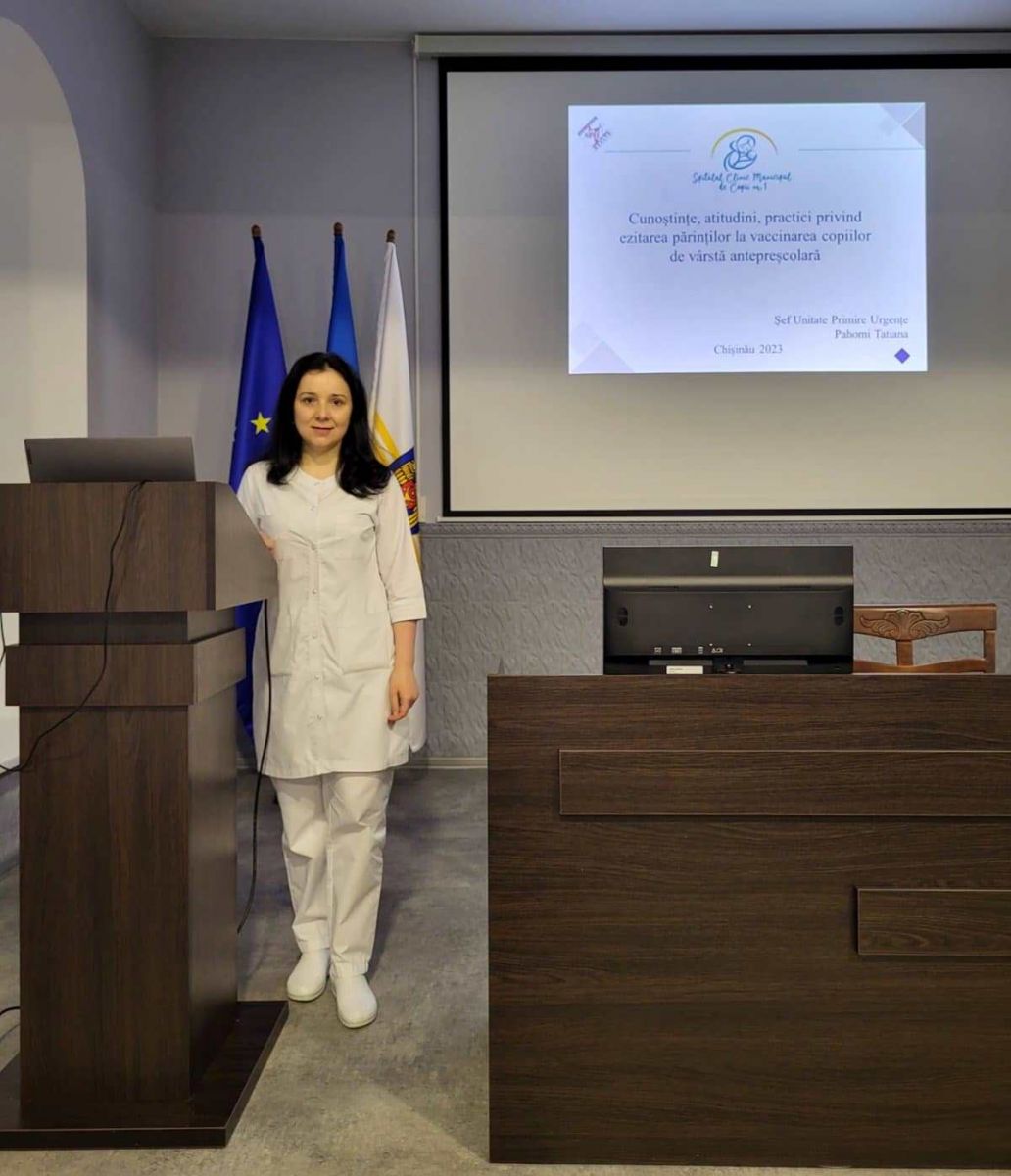 Având în vedere creșterea fluxului de informații privind vaccinările, inclusiv campaniile antivaccin, Dna doctor Tatiana Pahomi, șef UPU, a prezentat Studiul ”Cunoștințe, atitudini, practici privind ezitarea ezitarea părinților la vaccinarea copiilor de vârstă antepreșcolară”, realizat în cadrul Școlii de Management în Sănătate Publică.