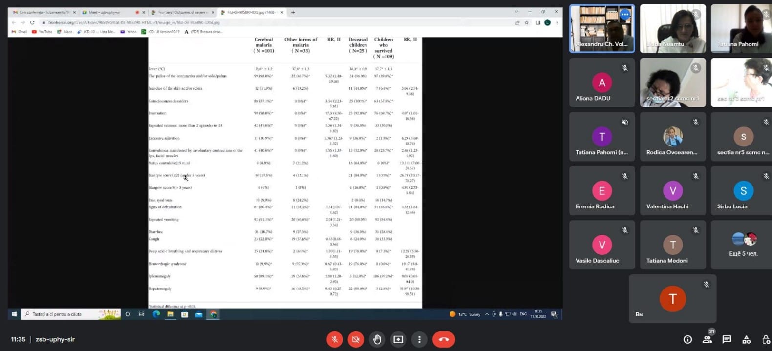 O valoare deosebită întrunirii desfășurate au prezentat informațiile, oferite de către domnul Profesor universitar Alexandu Voloc, în baza experienței profesionale personale cu pacienți bolnavi de malarie în țările africane, reflectate în publicații științifice în reviste de specialitate internaționale cu factor de impact („Outcomes of severe malaria and its clinical features în Gabonese children” și „Malaria beyond its predominant endemic regions: Emerging threat or sporadic events?”).