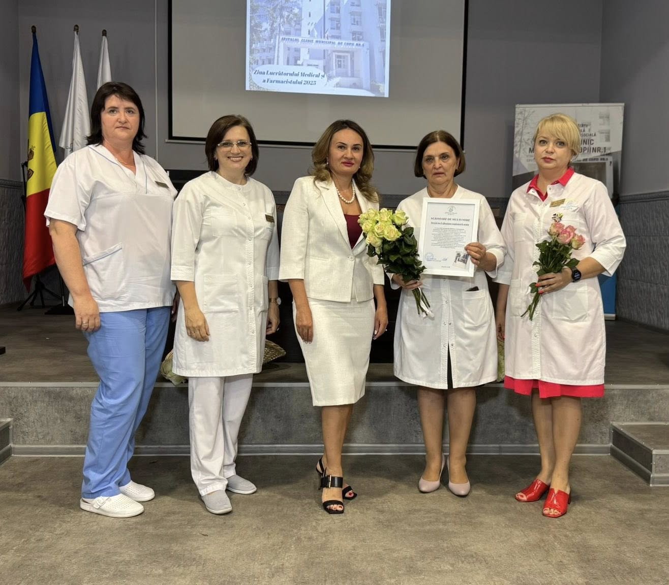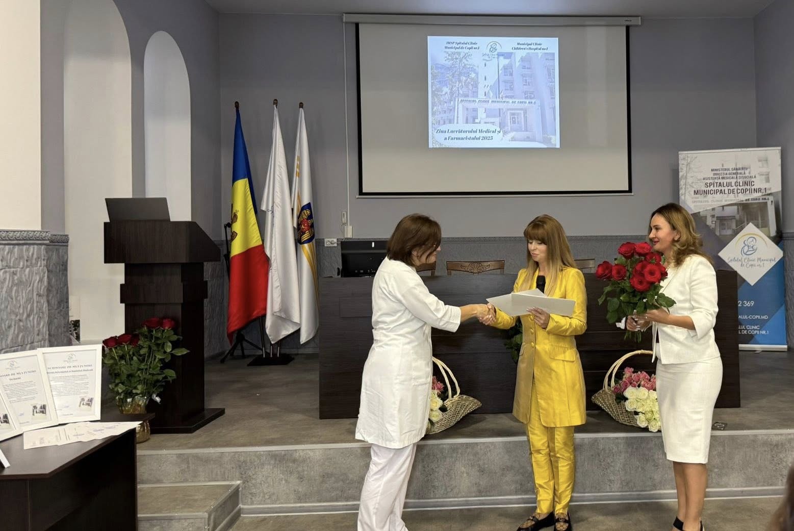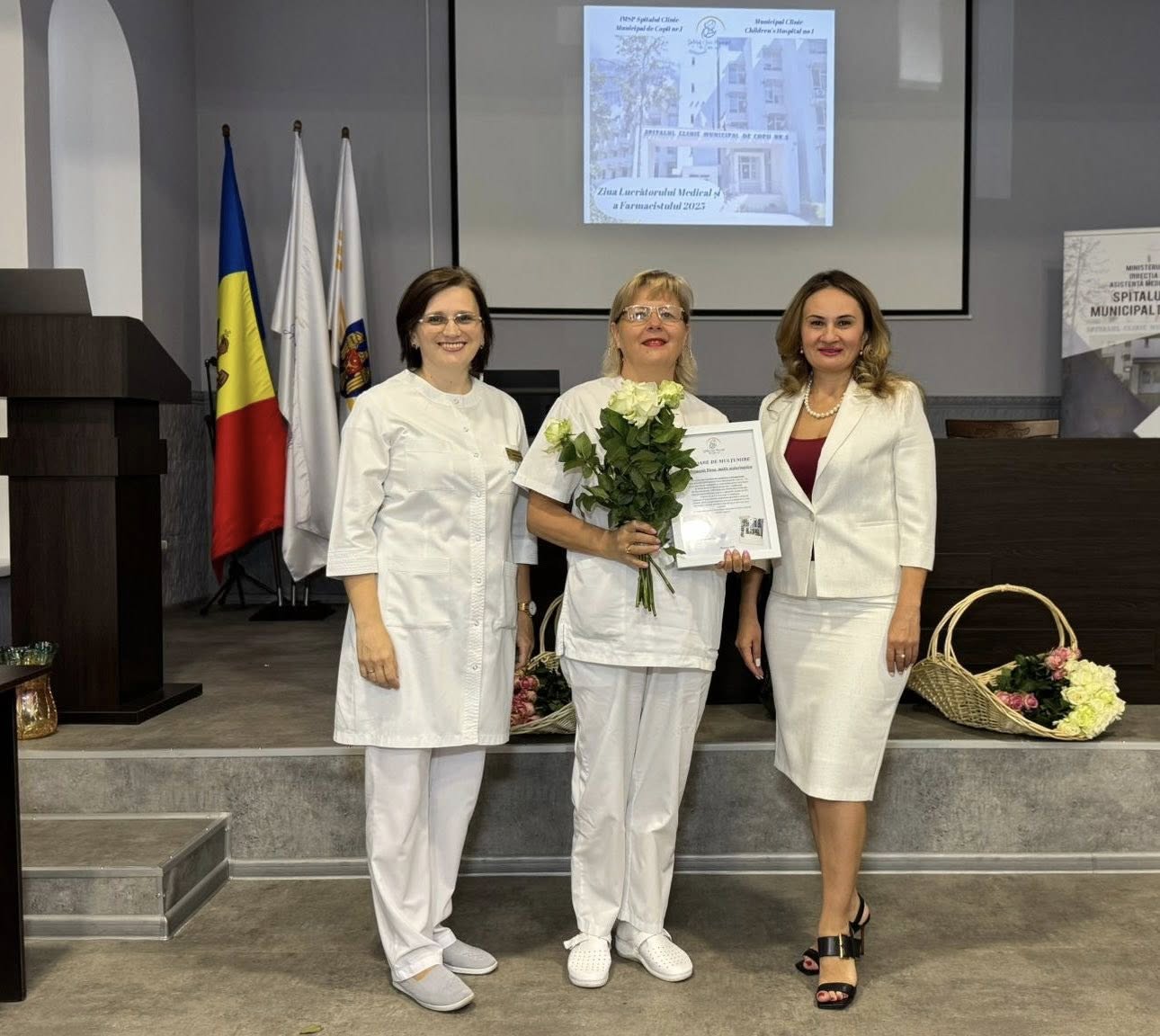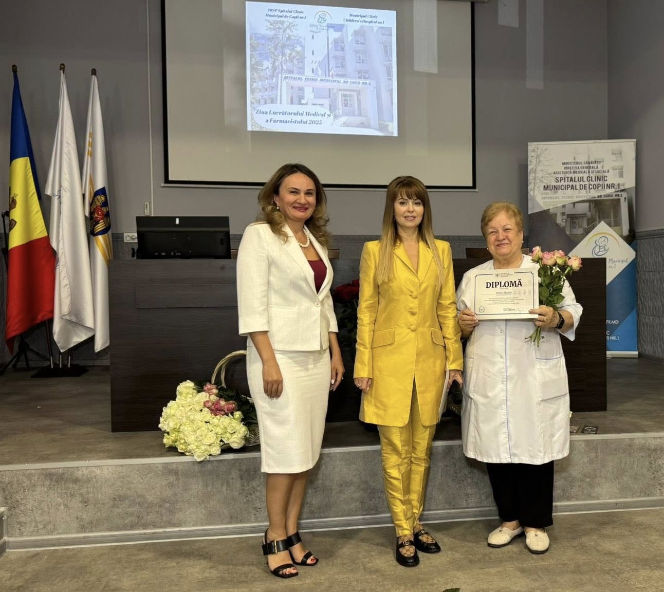 Dna Irina Gutnic, viceprimar al municipiului Chișinău, care a transmis un mesaj oficial de felicitare din partea fondatorului – Primăria municipiului Chișinău. Doamna viceprimar și-a exprimat aprecierea față de munca nobilă a lucrătorilor medicali și a înmânat diplome de gratitudine ca semn al respectului și recunoștinței pentru activitatea depusă în slujba sănătății publice.