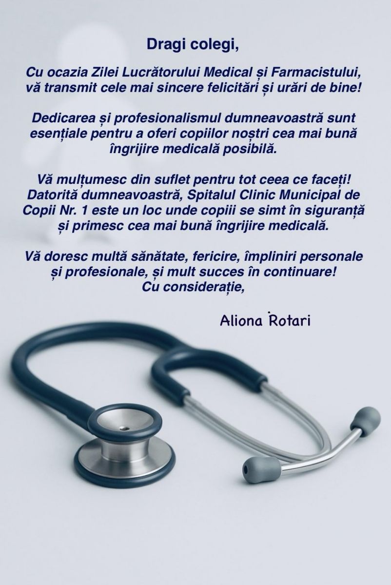 În această zi de sărbătoare, transmitem tuturor lucrătorilor medicali cele mai sincere urări de sănătate, împliniri și putere de a continua, cu aceeași pasiune și devotament, nobila misiune de a îngriji viața.