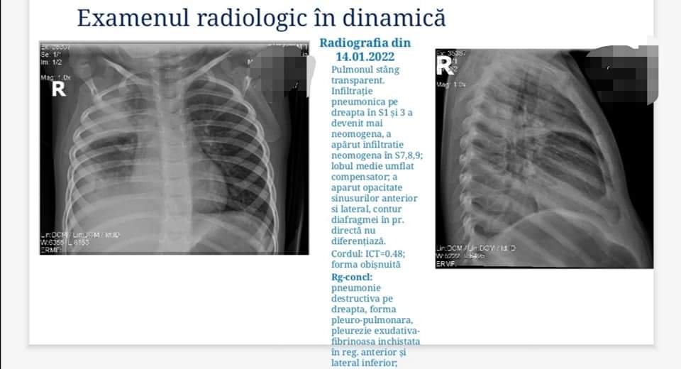 Cazul clinic relevant, asistat reușit în cadrul instituției în ianuarie 2022, a completat în mod deosebit informația prezentată. Doamna Neamțu Liuba, vicedirector medical, care a coordonat studiul de caz a prezentat evoluția procesului consultativ diagnostic al unui pacient în vârstă de 32 luni, cu diagnosticul de Pneumonie franc - lobară, în care ecografia pulmonară a permis identificarea pleureziei exudative și dinamica nefavorabilă a procesului pe fondal de tratament aplicat, influențând argumentat modificarea conduitei clinice.