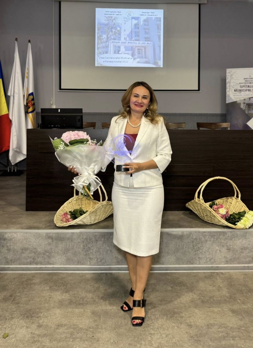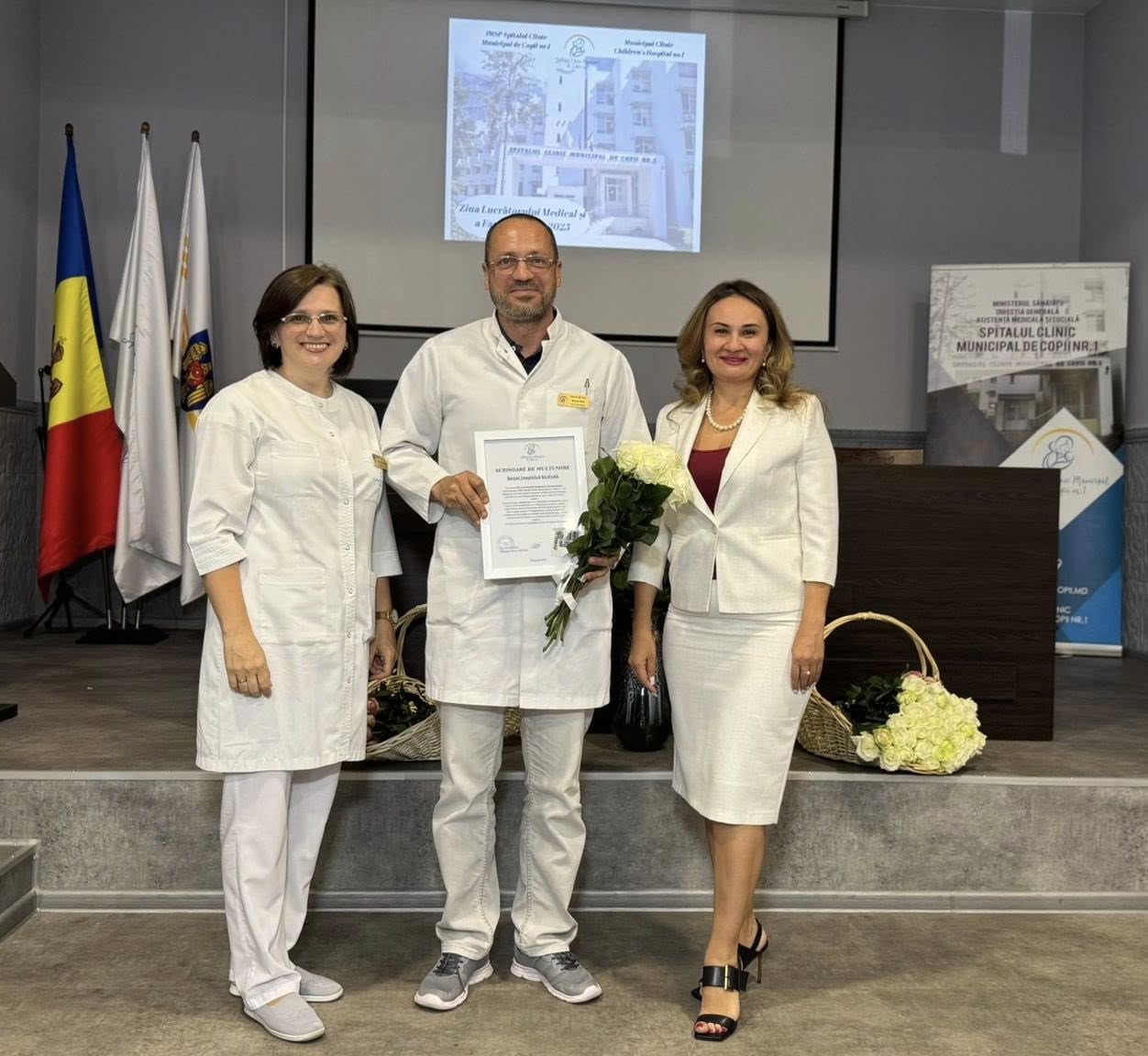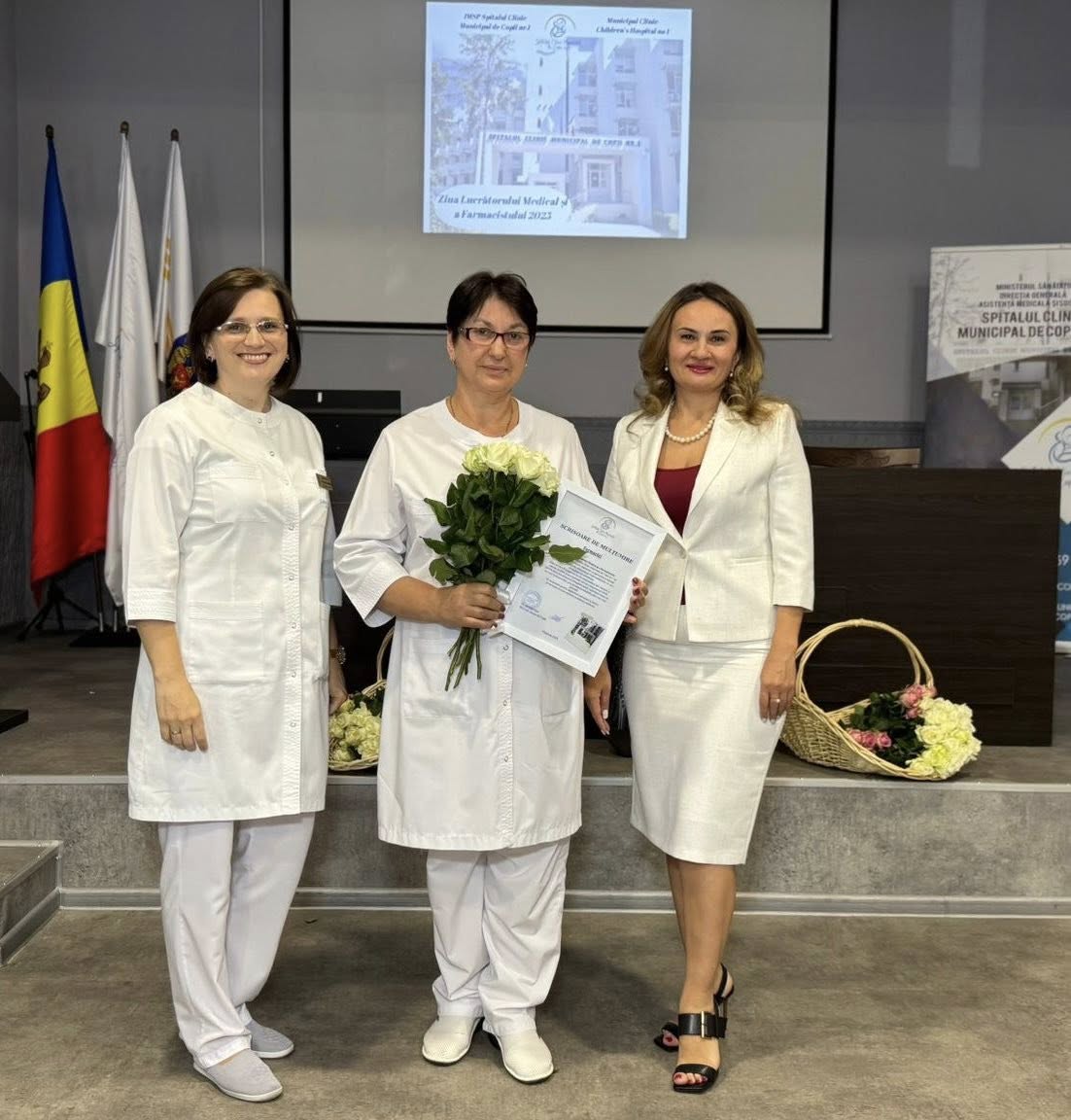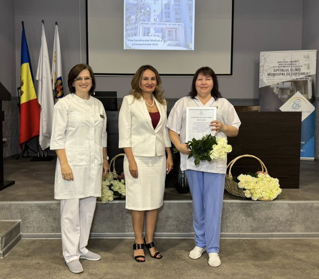 Dna Irina Gutnic, viceprimar al municipiului Chișinău, care a transmis un mesaj oficial de felicitare din partea fondatorului – Primăria municipiului Chișinău. Doamna viceprimar și-a exprimat aprecierea față de munca nobilă a lucrătorilor medicali și a înmânat diplome de gratitudine ca semn al respectului și recunoștinței pentru activitatea depusă în slujba sănătății publice.