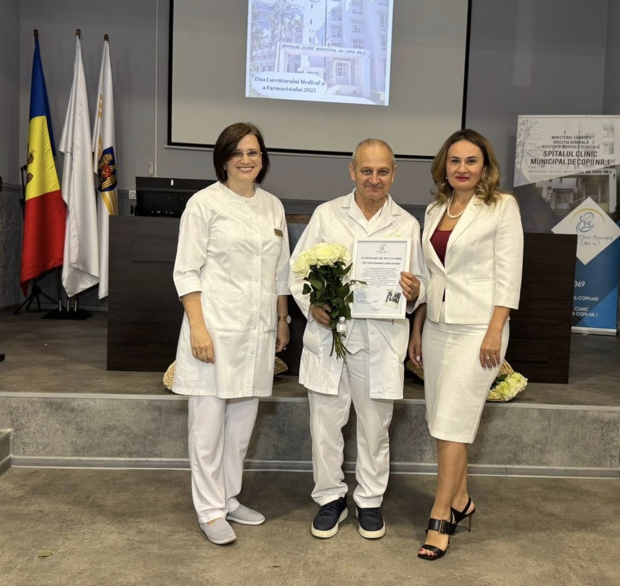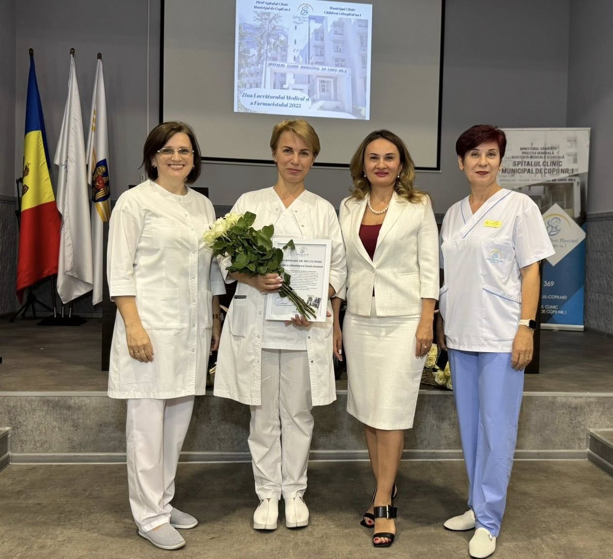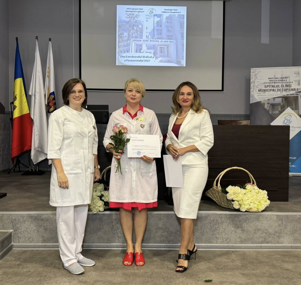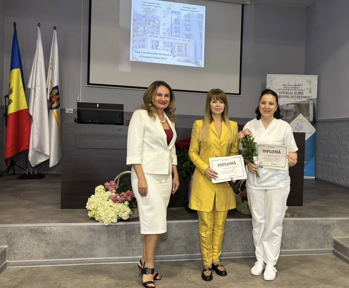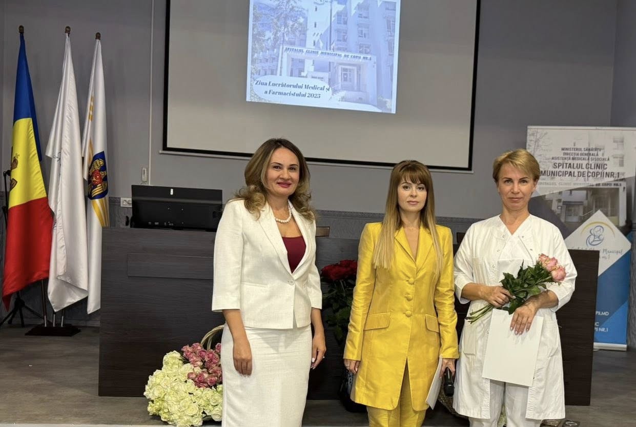 Dna Irina Gutnic, viceprimar al municipiului Chișinău, care a transmis un mesaj oficial de felicitare din partea fondatorului – Primăria municipiului Chișinău. Doamna viceprimar și-a exprimat aprecierea față de munca nobilă a lucrătorilor medicali și a înmânat diplome de gratitudine ca semn al respectului și recunoștinței pentru activitatea depusă în slujba sănătății publice.